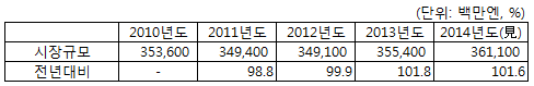 2014 년도 에스테틱 살롱 시장규모(사업자 매출액 기준)는 전년대비 101.6%인 3,611 억엔으로 전망된다.