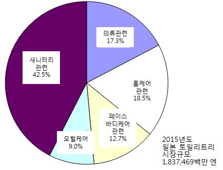 2015년도 일본 토일리트리 시장규모(메이커 출하금액 기준)는 전년도 대비 103.3%인 1조 8,374억 6,900만 엔이었다. 본래의 효과·실감과 같은 실용성과 함께 기분·정서적으로 호소하는 쾌적성 및 생활의 질 향상을 소구하는 제품군에 의해 소비자의 가치관이 다양화 되고 있어 2015년도도 플러스 성장하였다. 분야별로는 새니터리 관련 시장이 방일 외국인 관광객에 의한 인바운드 수요 및 고령화를 배경으로 확대했다. 또한 오랄케어 관련 시장은 구강케어에 따른 위생 의식, 쾌적성·에티켓·청결감 등의 의식 고양을 배경으로 신장했다.