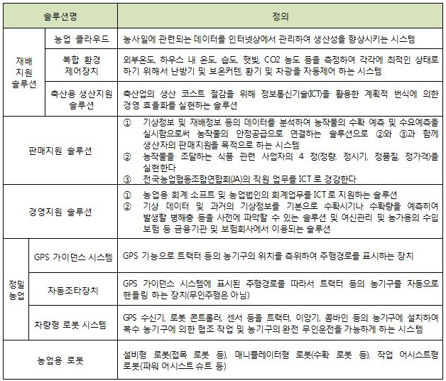 본 조사에서 스마트농업이란 기존 농업기술과 로봇 기술 및 ICT등의 첨단기술을 제휴시키는 것으로 초생력화 및 고품질 생산 등을 가능하게 하는 새로운 농업이며, 농업의 생산부터 판매까지 첨단기술을 활용하여 높은 농업 생산성 및 코스트 삭감, 음식의 안전성 및 노동의 안전등을 실현하는 것이다.