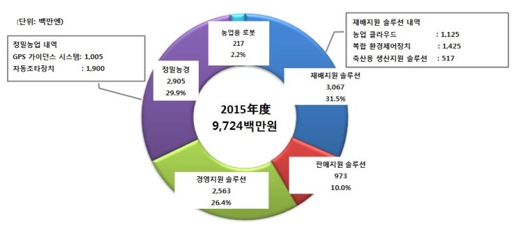 본 조사에서 스마트농업 시장규모는 ①재배지원 솔루션(농업 클라우드, 복합 환경제어장치, 축산용 생산지원 솔루션), ②판매지원 솔루션, ③경영지원 솔루션, ④정밀농업(GPS 가이던스 시스템, 자동 조타장치, 차량형 로봇 시스템), ⑤농업용 로봇을 대상으로 산출했다. (자세한 것은 표 1을 참조) 덧붙여 일본국내 시장을 대상으로 하여 시장규모에는 농업용 POS 시스템, 농기구, 농업용 드론 등은 제외한다.