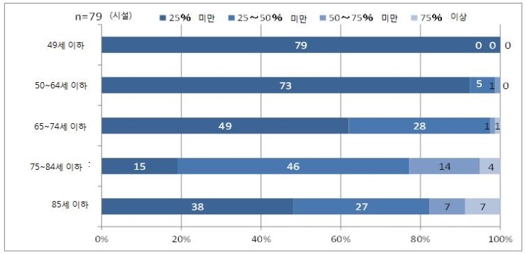 일본에서 재활치료과를 진료과로 갖추고 있는 병원(집계대상 79건)을 대상으로 뇌졸중 재활치료 환자의 연령 구성에 대해서 조사한 결과, 「85세 이상」 환자가 75% 이상을 차지하는 시설이 7곳, 50~75% 미만이 7곳이었다. 또한 「75~84세 이하」 환자가 75% 이상을 차지하는 시설이 4곳, 50~75% 미만이 14곳으로 약 20%의 시설에서 75세부터 84세 이하의 고령자가 과반수를 넘었다. 한편 「49세 이하」의 환자는 모든 시설에서 25% 미만으로 고령자가 꽤 많다는 결과가 나왔다.