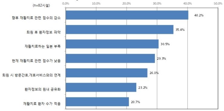 일본에서 재활치료과를 진료과로 갖추고 있는 병원(집계대상 82곳)을 대상으로 뇌졸중 환자의 재활치료에 대한 과제·문제점에 대해서 해당되는 것을 3개까지 선택(복수회답)하도록 하였다. 회답이 많았던 상위 7위까지를 그림3에 표기하였는데, 「향후 재활치료 관련 점수의 감소」가 40.2%로 가장 높고, 「퇴원 후의 환자정보 파악」 35.4%, 「일손 부족」 30.5%, 「현재 재활치료 관련 점수가 낮다」 29.3%, 「퇴원 시 방문간호·개호 서비스와의 제휴」 26.8% 순이었다.