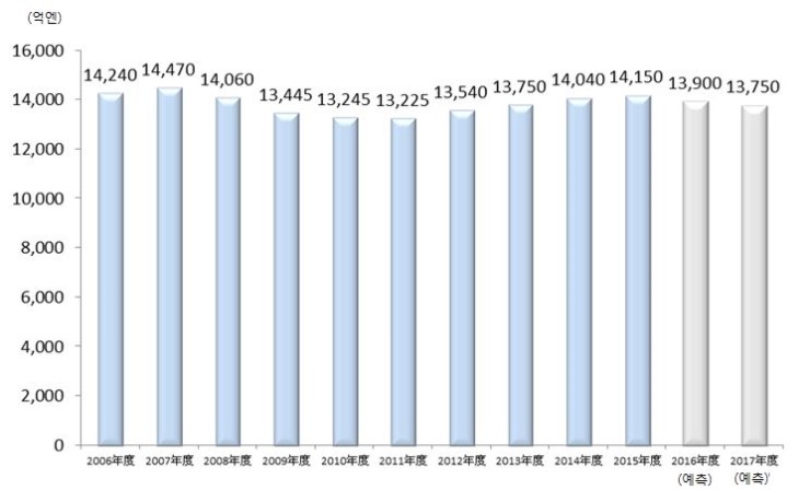 2016년도 일본국내 구두•신발 소매시장 규모는 전년도 대비 98.2%인 1조 3,900억엔을 예측한다. 인바운드(방일외국인관광객) 수요가 감소하고 스포츠화의 성장률 둔화와 함께 신사구두, 여성구두도 축소 경향이므로 마이너스 성장으로 전환될 것으로 예측된다. 신사구두에서는 오피스의 캐주얼화(쿨비즈/웜비즈)가 정착함에 따라 드레스•비즈니스 슈즈의 착용 기회의 감소, 여성구두에서는 소비자 트렌드가 캐주얼 스니커즈로 바뀌어 수요가 축소하고 있는 것으로 보인다. 일본국내 구두•신발 소매시장은 향후도 스포츠 슈즈를 주축으로 추이하겠지만, 전체 시장규모는 축소 기조라고 생각된다.