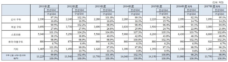 표 1. 구두•신발 소매시장 아이템별 시장규모 추이