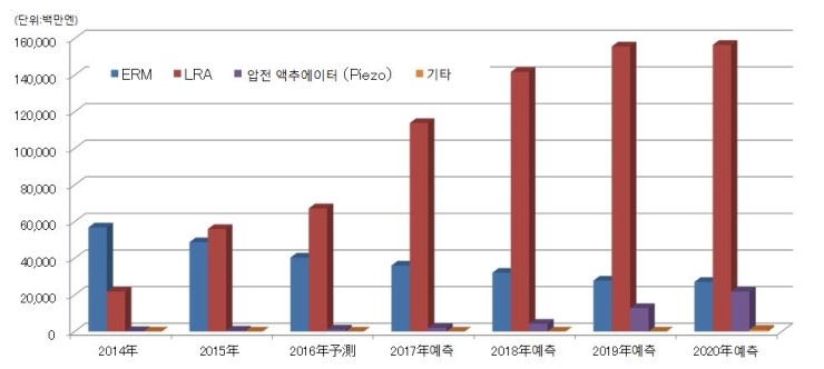 포스 피드백 디바이스에는 ERM, LRA, 압전 액추에이터 등이 있다. 최근까지 포스 피드백 디바이스는 구동 회로가 심플하고 소형이면서 저가격인 ERM이 중심이었지만 고진동•고품위에 의한 포스 피드백 기능을 요구하는 니즈가 증가하고 있어 단가가 비싼 LRA의 채용이 더욱 확대하고 있다. 향후, 스마트폰을 중심으로 ERM에서 LRA으로의 전환이 더욱 진행됨에 따라 2017년 포스 피드백 디바이스 세계 시장규모에서 차지하는 LRA 비율은 74.9%로 상승할 것으로 예측된다.