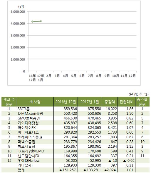2017년 1월말 유력 FX기업 16사*1의 계좌 수 합계는 419만 계좌였다. 1월은 전월대비 4.2만 계좌 증가(1.01% 증가)했다. 본 조사 대상기업 16사 중 15사(기타 기업 2사 포함)에서 계좌 수가 증가했다.