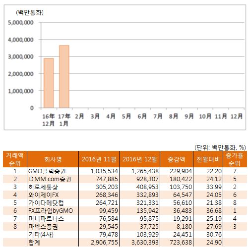 ◆2017년 1월 거래액 제1위는 GMO클릭증권, 제2위는 DMM.com증권