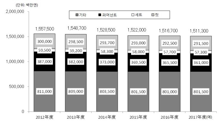 이러한 경향은 계속되고 있어 2017년도 이미용 시장규모(동 기준)를 전년도 대비 99.6%인 2조 1,490억엔으로 예측한다.