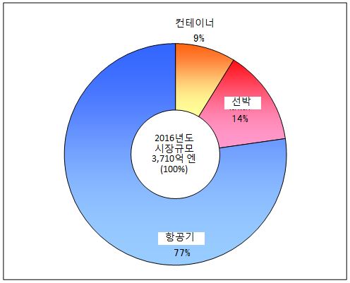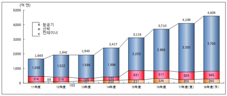 상품 분야별 구성비에서는 2016년도에 항공기 확대를 요인으로 선박의 구성비가 14%로 저하, 항공기 77%, 컨테이너 9%였다. 2017년도 이후의 구성비도 항공기는 확대, 선박과 컨테이너는 축소세로 추이할 것으로 예측된다.