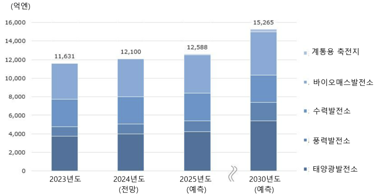 2024년도 시장규모를 설비별로 보면, 바이오매스발전소가 가장 크고, 태양광발전소, 수력발전소, 풍력발전소, 계통용 축전지 순이다. 바이오매스발전소는 다른 신에너지 발전설비에 비해 운전유지비용이 비싸기 때문에 시장 전체에서 차지하는 비중이 커지고 있다.